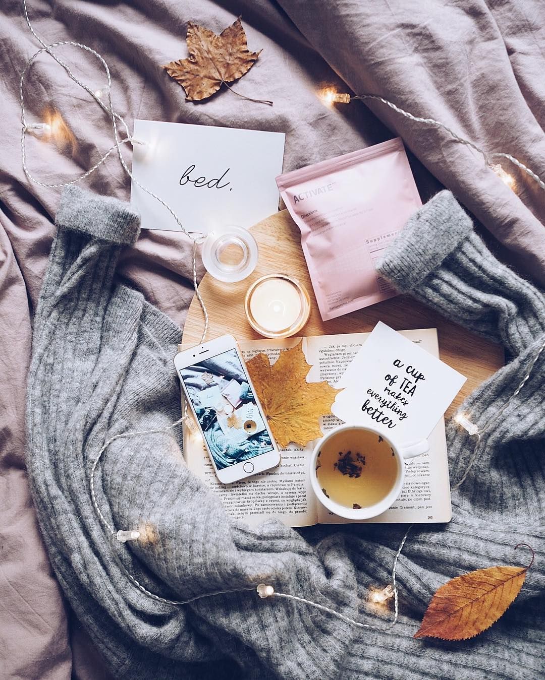 Инстаграм в стиле хюгге. Шапки, шарфы и свитера крупной вязки, светлые оттенки на фоне сдержанного интерьера в скандинавском стиле или природы. В кадр часто попадают чашки с кофе или какао, которые делают фотографии еще более уютными.