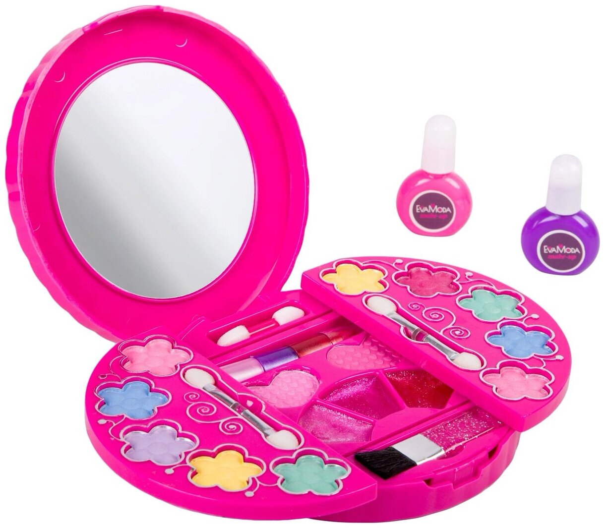 Для макияжа куклы вам нужны розовые и фиолетовые тени, тональный крем, пудра, румяна, подводка, карандаш для бровей и красная помада.