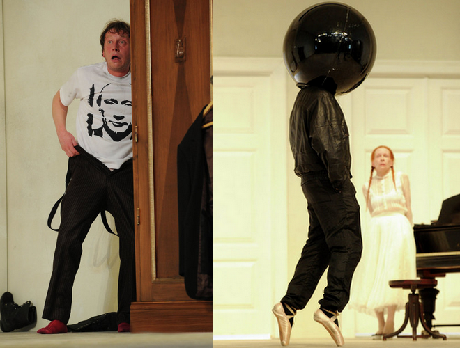 Белое-черно-серое пространство художника-минималиста Серебренникова вступает в диалог с режиссурой Серебренникова, тяготеющей в этом спектакле к избыточности и почти барочности. Костюмы тоже далеки от минимализма — 20-е годы, Follies Bergere и приметы современности. По сцене бродит старая балерина — рыжий дух квартиры – в виде «вечной женственности» – гибрид соллогубовской Недотыкомки и Пины Бауш (Татьяна Кузнецова). Она, как чеховский Фирс, останется на сцене в конце спектакля, когда всех остальных арестуют бесчувственные юноши во фраках и желтых ботинках. Перефразируя название фильма Гай Германики, можно сказать: «Все умрут, а балет останется», ибо «балет в России – больше чем балет», и «Лебединым озером» заменялась не одна программа политических новостей.