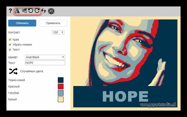 - Изначально обратите внимание на верхнюю панель в редакторе. Здесь вы можете сделать отражение и/или поворот изображения на определённую градусную величину. Для этого кликайте по первым четырём значкам слева.